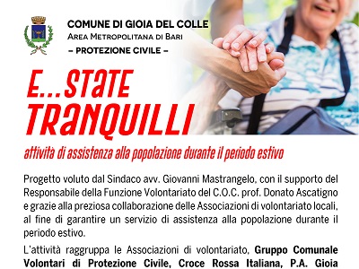 Progetto voluto dal Sindaco avv. Giovanni Mastrangelo, con il supporto del Responsabile della Funzione Volontariato del C.O.C. prof. Donato Ascatigno e grazie alla preziosa collaborazione delle Associazioni di volontariato locali, al fine di garantire un servizio di assistenza alla popolazione durante il periodo estivo.