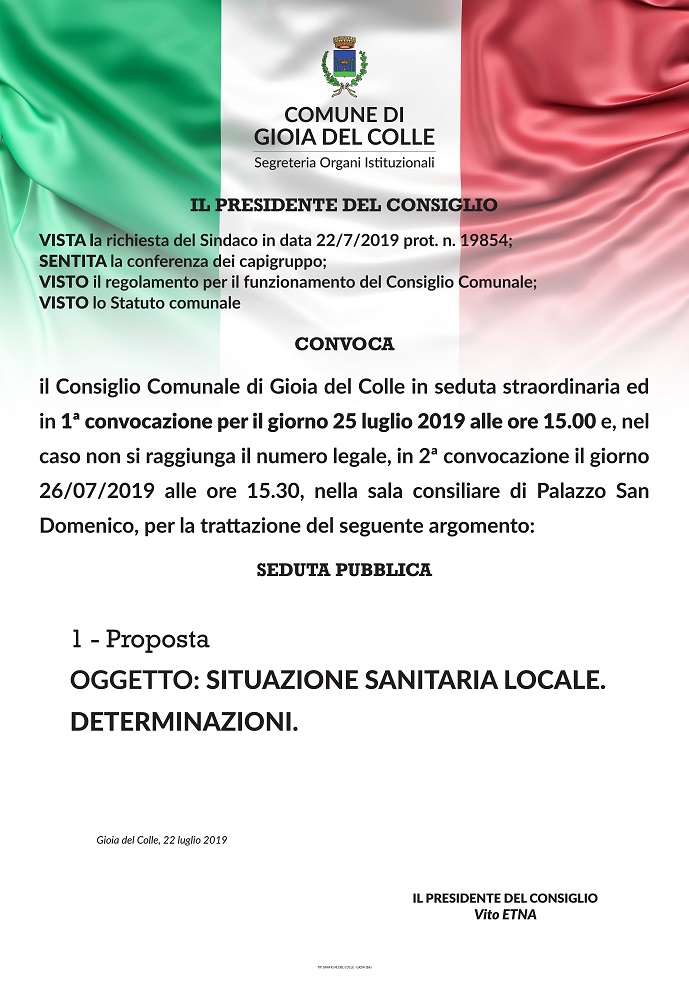 Il Giorno 25 Luglio alle ore 15,30 č convocato il Consiglio Comunale monotematico per discutere della situazione sanitaria locale.