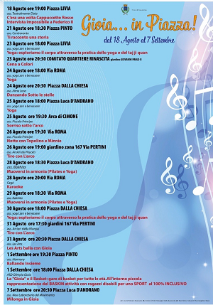 L’assessorato alla Cultura del Comune di Gioia del Colle, di concerto con quello dello Sport, al fine di incrementare ancora maggiormente il programma degli eventi estivi dal titolo IOHA aeStaS duemiladiciannove, ha inteso coinvolgere le scuole di ballo e le accademie di danza della città, per la organizzazione di ulteriori eventi serali da svolgersi nel pieno della stagione estiva fino alla prima decade di settembre.