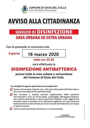 Con la presente si comunica che il giorno 18 marzo 2020 dalle ore 23.30 sarą effettuata la disinfezione antibatterica presso tutte le aree urbane ed extraurbane del Comune di Gioia del Colle.