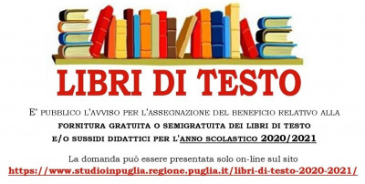 Scarica l'avvisoIn riferimento al contributo per la Fornitura dei Libri di testo delle scuole secondarie di I e II grado per l'a.s. 2020/21, si comunica che con AD n. 43 del 28/04/2020 la Regione Puglia ha emanato l'Avviso pubblico per l'individuazione del beneficiari, valido sull'intero territorio regionale.