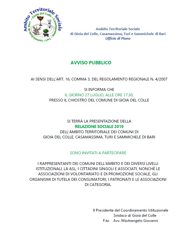 Ai Sensi dell'Art. 16, Comma 3, del Regolamento Regionale N. 4/2007, si informa che il giorno 27 luglio, alle ore 17.30, presso il chiostro del comune di Gioia del Colle si terrà la presentazione della Relazione Sociale 2019 dell’Ambito Territoriale dei comuni di Gioia del Colle, Casamassima, Turi e Sammichele di Bari.