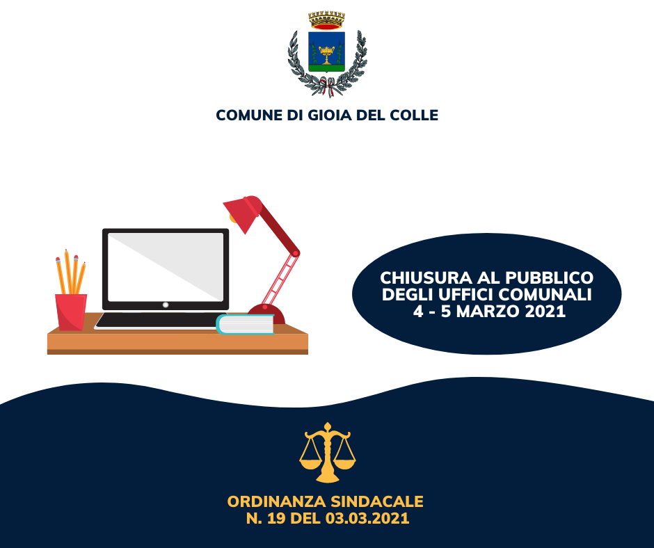 Con ordinanza n. 19 del 3 marzo 2021 il Sindaco, a seguito di emergenza epidemiologica da Covid-19, ha disposto che gli uffici comunali rimangano chiusi al pubblico e all'utenza in data 4 e 5 marzo 2021 nelle more di ulteriore sanificazione degli ambienti comunali eccezion fatta per i seguenti servizi essenziali: