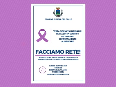 Per tale occasione il Comune di Gioia del Colle ha deciso di aderire alla Campagna Fiocchetto Lilla, promossa da ANCI e Never Give Up Onlus, organizzando un webinar dal titolo "Facciamo rete! Informazione, prevenzione e trattamento dei Disturbi del Comportamento Alimentare" con il coinvolgimento di professionisti del territorio che prestano la loro attività nel percorso di cura e riabilitazione da tali patologie.