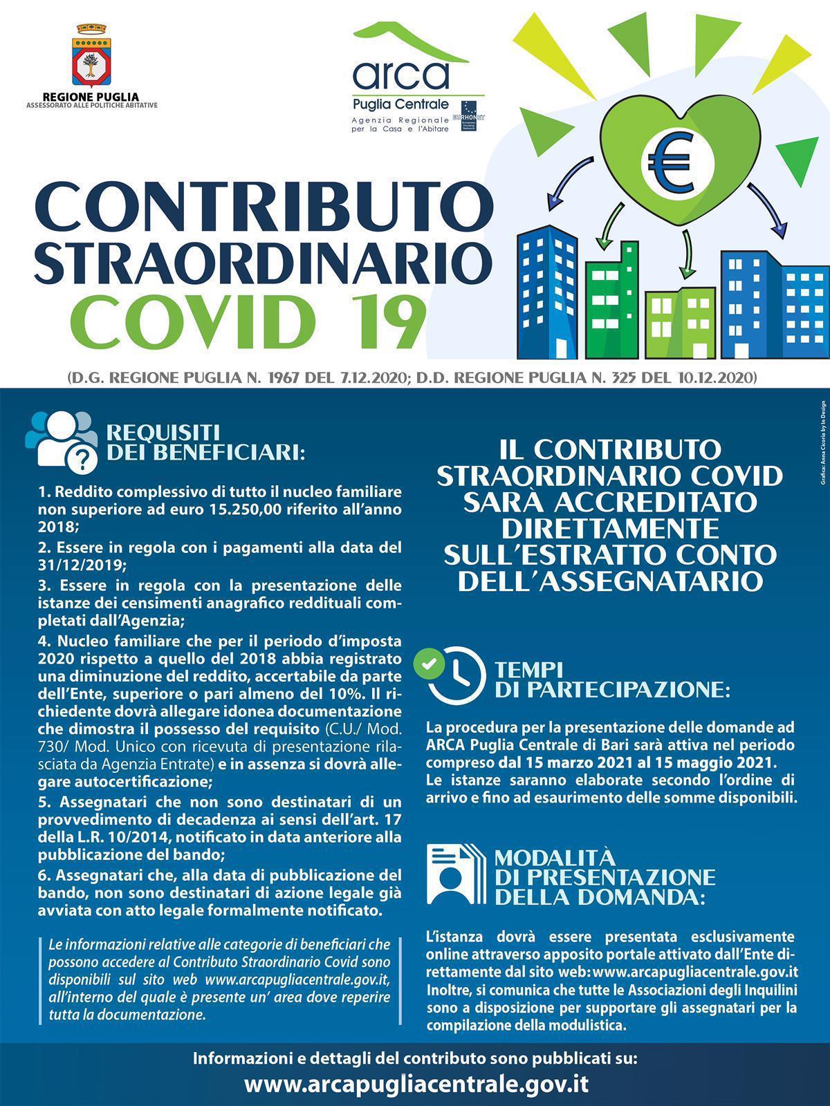 L'ARCA PUGLIA CENTRALE (AGENZIA REGIONALE PER LA CASA E L'ABITARE), HA ATTIVATO APPOSITA PROCEDURA PER CONSENTIRE AGLI ASSEGNATARI DEGLI ALLOGGI DI E.R.P., IN POSSESSO DEI REQUISITI PRESCRITTI, DI OTTENERE L'EROGAZIONE DEL CONTRIBUTO FONDO STRAORDINARIO COVID PER CANONI E SERVIZI.