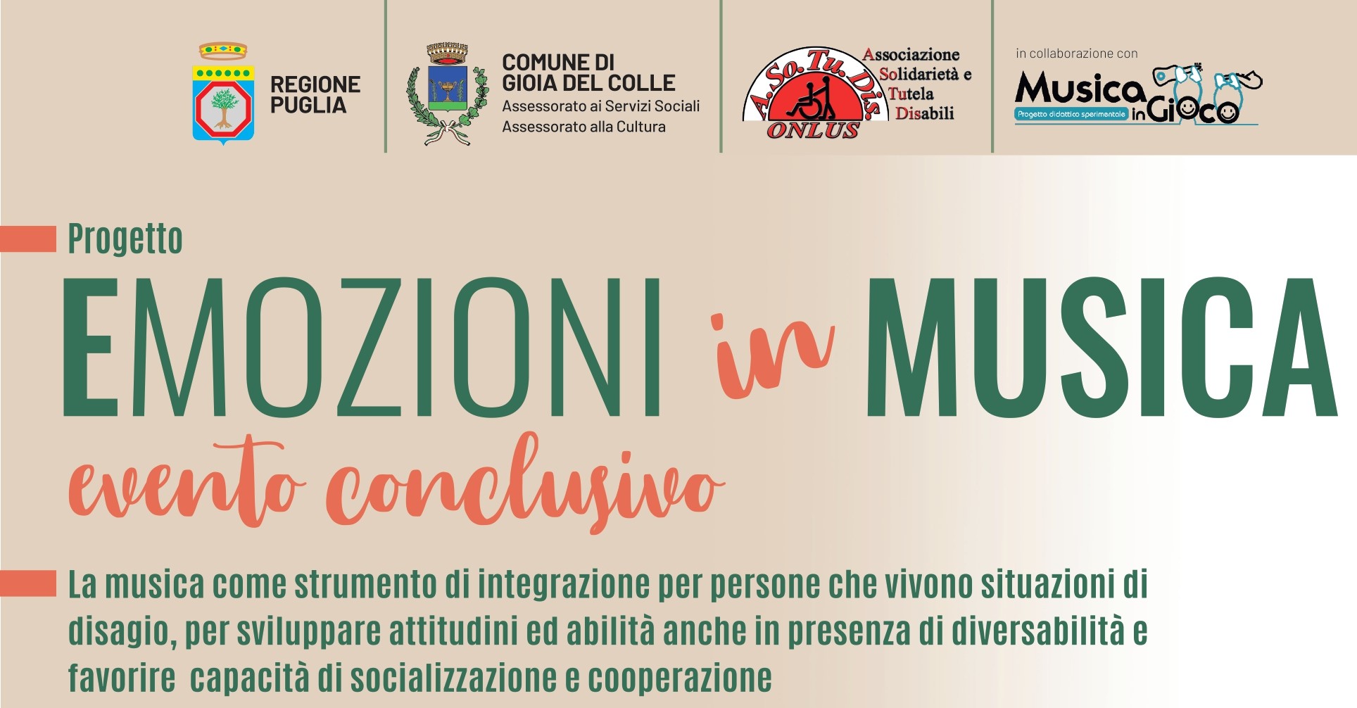 Grazie al prezioso lavoro di coordinamento svolto dall'Associazione A.so.tu.dis., alla collaborazione degli istituti scolastici gioiesi, dell'associazione MusicaInGioco e delle psicologhe coinvolte, si porta così a compimento un progetto che, nel corso di un anno, ha dato, altresì, l'opportunità ai quaranta partecipanti di acquisire specifiche competenze nell'utilizzo di strumenti musicali.