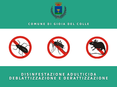 Lunedì 30 Agosto 2021, sull'intero territorio comunale, saranno eseguiti gli interventi di deblattizzazione e derattizzazione e, a partire dalle ore 23:30, quello di disinfestazione adulticida.