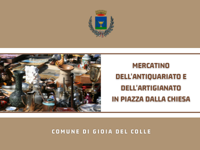 Si informa la cittadinanza che, con Deliberazione di Giunta n. 203 del 9 settembre 2021, l'Amministrazione comunale di Gioia del Colle ha istituito, in via straordinaria, il mercatino dell'Antiquariato e dell'Artigianato, da svolgersi la seconda domenica di ogni mese in piazza Dalla Chiesa.
