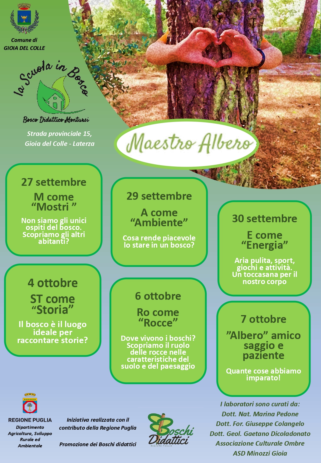 I sei laboratori sono tenuti dalla dott.ssa nat. Marina Pedone, dal dott. for. Giuseppe Colangelo, dal dott. geol. Gaetano Dicoladonato, dall'Associazione Culturale Ombre e dall'ASD Basket Minozzi.