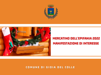 Si rende noto alla Cittadinanza tutta, che è volontà di questa Amministrazione far svolgere il tradizionale “MERCATINO DELL’EPIFANIA” come previsto dal “PIANO COMUNALE DEL COMMERCIO SU AREE PUBBLCHE” approvato con deliberazione del Consiglio Comunale n. 55/2001 e sue modificazioni da svolgersi in via Vittorio Emanuele nella serata del 5 gennaio 2022 dalle ore 16.00 alle ore 24.00. Gli operatori economici del settore interessati possono presentare opportuna comunicazione di adesione al Settore URBANISTICA-SUAP-Commercio entro e non oltre il 15 dicembre 2021 al seguente indirizzo pec: suap.gioiadelcolle@pec.rupar.puglia.it
