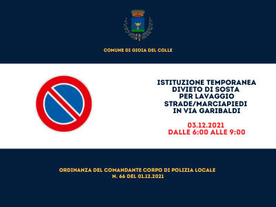 Si informa la cittadinanza che, al fine di consentire lo svolgimento dell'attivitą di lavaggio di strade/marciapiedi da parte della Navita srl, il Comandante della Polizia Locale ha disposto, ????? ??? ?:?? ???? ??? ?:?? ?? ???????? ? ???????? ????, il temporaneo divieto di sosta in via Garibaldi.
