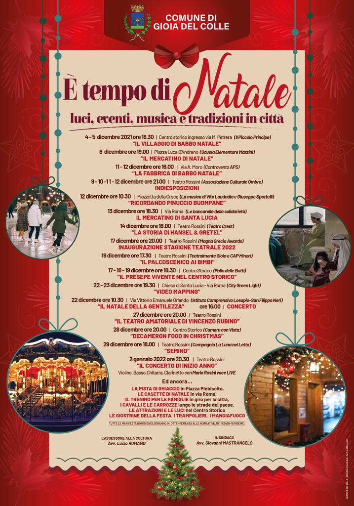 Gioia del Colle si appresta a vivere un Natale di luci, di eventi, di musica e tradizioni. Dal centro storico alle periferie, la magica atmosfera natalizia è pronta ad invadere le vie della città che, da sabato 4 dicembre 2021 a giovedì 6 gennaio 2022, saranno animate da manifestazioni, spettacoli, attrazioni, concerti e proiezioni luminose inserite nel programma di eventi “È tempo di Natale”, presentato oggi dall’Amministrazione Mastrangelo nel corso di una conferenza stampa nella sala Javarone di Palazzo San Domenico.