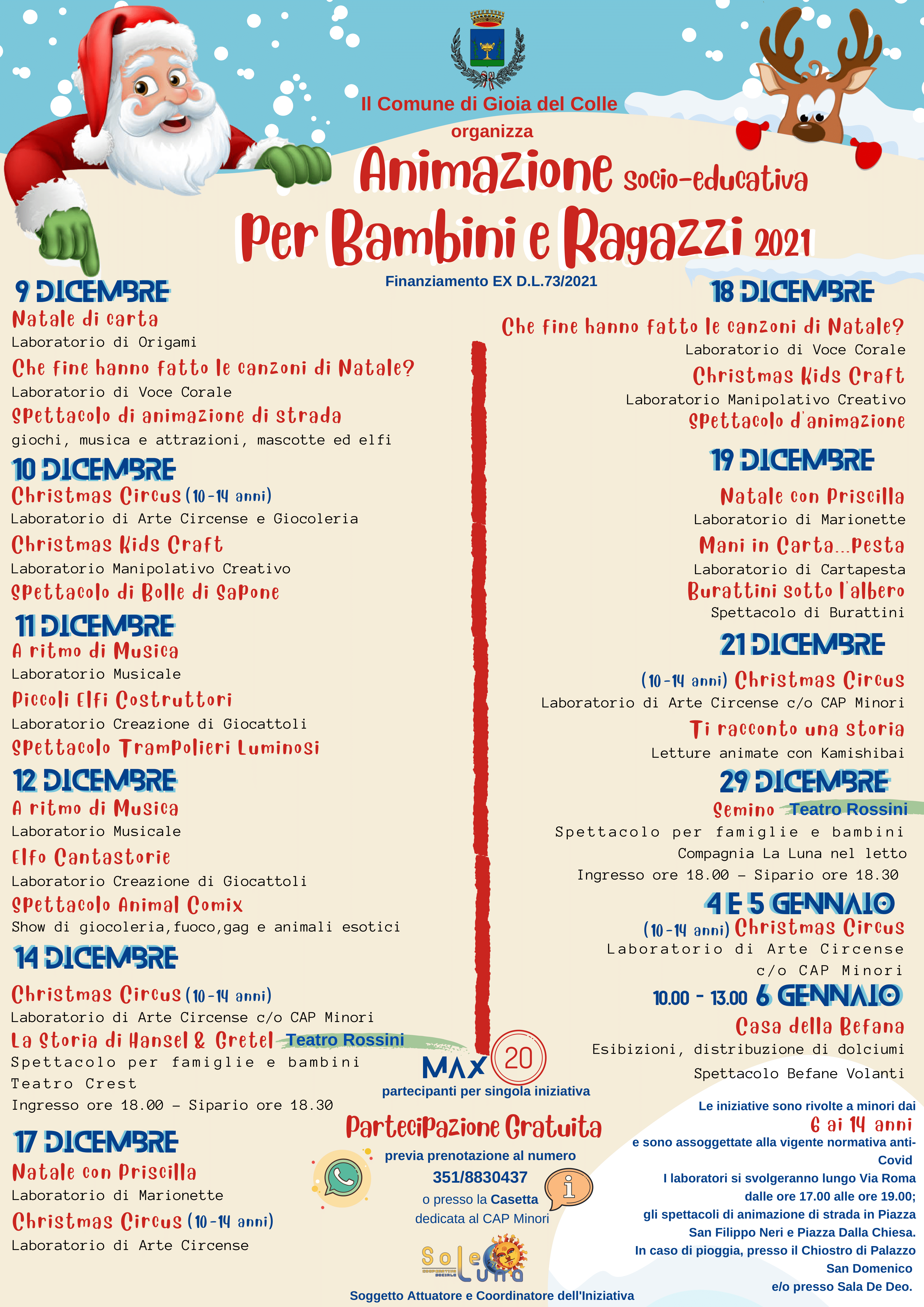 Si parte con una serie di iniziative pensate per i più piccoli: nel weekend del 4-5 dicembre sarà possibile visitare il Villaggio di Babbo Natale (a cura de “Il Piccolo Principe”) all’interno del centro storico mentre dall’11 al 12 dicembre sarà allestita la Fabbrica di Babbo Natale (a cura di “Controvento” APS) in via Aldo Moro. Sempre per bambini e ragazzi è stato predisposto, inoltre, un ricco calendario di attività socio-educative che si svolgeranno, sotto il coordinamento della Società Cooperativa Sociale Soleluna, in via Roma, in piazza Carlo Alberto Dalla Chiesa e in piazza San Filippo Neri.