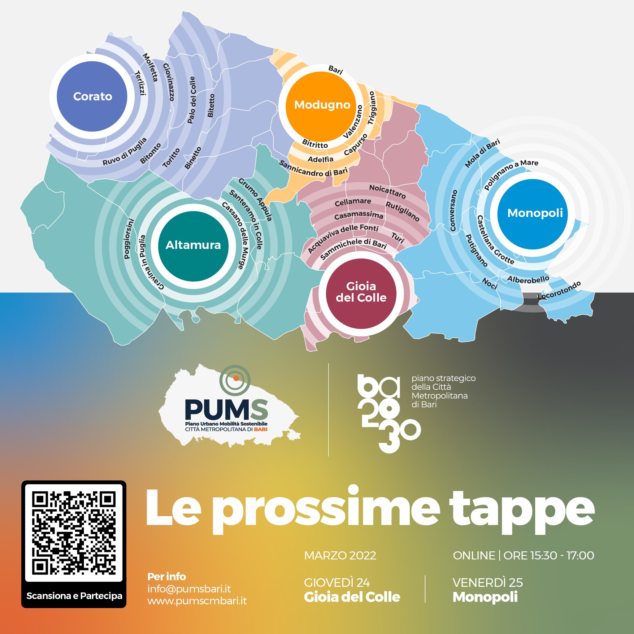 Giovedì 24 marzo 2022, in un incontro organizzato sulla piattaforma Zoom, la Città Metropolitana di Bari presenterà il Piano Urbano per la Mobilità Sostenibile ai comuni dell’ambito di Gioia del Colle (Gioia del Colle, Sammichele di Bari, Acquaviva delle Fonti, Turi, Casamassima, Cellamare, Rutigliano e Noicattaro).
