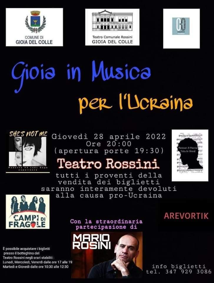 In continuità con le iniziative di solidarietà a sostegno della popolazione ucraina, l’Amministrazione comunale di Gioia del Colle, con la collaborazione dell’associazione Collettivo Culturale, promuove il concerto “Gioia in musica per l’Ucraina”, che si terrà giovedì 28 aprile al Teatro comunale Rossini.