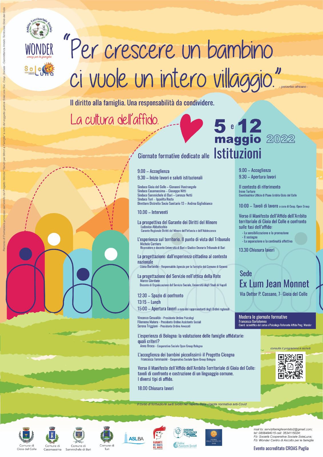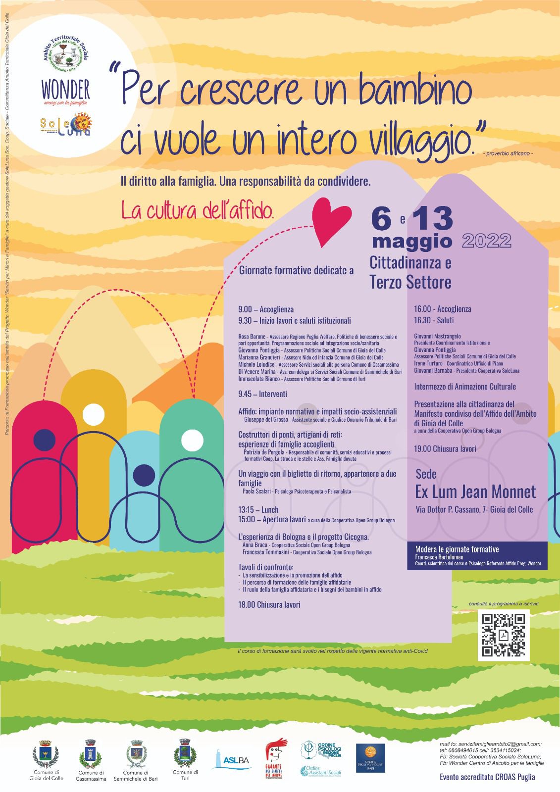 L’Ambito di Gioia del Colle, nell’ambito del progetto WONDER “Servizi per la famiglia”, in collaborazione con la Soc Coop Sociale Soleluna, è lieto di invitare istituzioni, cittadinanza ed Enti del Terzo Settore alle giornate formative dedicate al tema dell’affido.