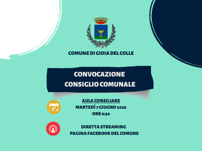 Il Consiglio Comunale di Gioia del Colle in seduta ordinaria ed in 1^ convocazione per il giorno 07 giugno 2022 alle ore 09,30 e, nel caso non si raggiunga il numero legale, in 2° convocazione il giorno 08/06/2022 alle ore 10,00, nella sala consiliare, per la trattazione dei seguenti argomenti: