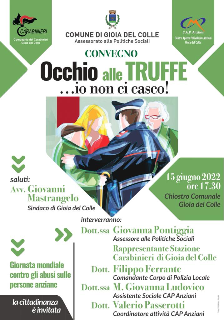 In occasione della Giornata mondiale contro gli abusi sulle persone anziane, che si celebrerà domani, mercoledì 15 giugno 2022, l'Amministrazione comunale ha organizzato, in collaborazione con la Compagnia dei Carabinieri di Gioia del Colle, il Corpo di Polizia Locale ed il Centro Aperto Polivalente Anziani, un convegno dal titolo "Occhio alle truffe...io non ci casco!".