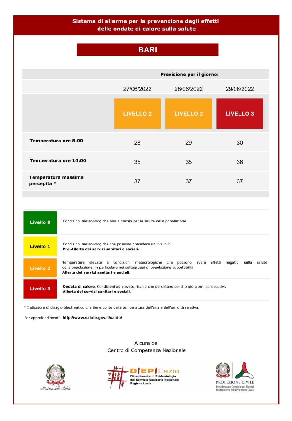Come comunicato dalla Protezione Civile della Regione Puglia, l’arrivo di aria calda di origine nord-africana determinerà un ulteriore incremento termico nella nostra Regione nei giorni 27, 28 e 29 giugno 2022.