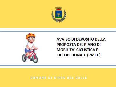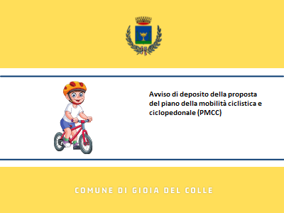 Il Direttore dell'Area Urbanistica rende noto che con Delibera di Giunta Comunale n. 220 dell’11/08/2022 l’Amministrazione ha adottato la proposta di Piano della Mobilità Ciclistica e Ciclopedonale (PMCC) del Comune di Gioia del Colle e che tutta la documentazione è depositata per un periodo di 30 gg presso la Segreteria Comunale, durante il quale chiunque può prenderne visione e formulare eventuali osservazioni.