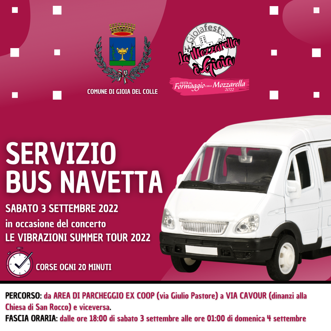 In occasione del concerto della rock band Le Vibrazioni, che si terrà sabato 3 settembre, ore 21:30, in piazza Plebiscito, sarà disponibile un bus navetta che collegherà l’area di parcheggio ex Coop (in via Giulio Pastore) a via Cavour (dinanzi alla chiesa di San Rocco, situata in prossimità del luogo dell’evento) e viceversa.