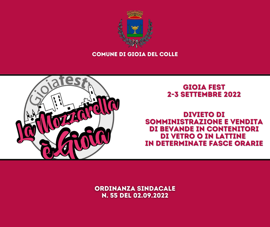 Si informa la cittadinanza e gli operatori commerciali interessati che, con Ordinanza n.55 del 02.09.2022, il Sindaco Avv. Giovanni Mastrangelo ha ordinato il divieto di somministrazione e vendita di bevande in contenitori di vetro o in lattine in determinate fasce orarie, in occasione della manifestazione denominata “Gioia Fest 2022” che si terrà nei giorni 2 e 3 settembre 2022.