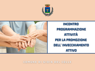 L’Amministrazione comunale di Gioia del Colle invita istituzioni, enti del Terzo Settore (associazioni, organizzazioni di volontariato e cooperative sociali), professionisti e singoli cittadini a partecipare ad un incontro, in programma martedì 13 settembre 2022, ore 16.00, nel Chiostro di Palazzo San Domenico, per la programmazione di attività finalizzate alla promozione dell’invecchiamento attivo.