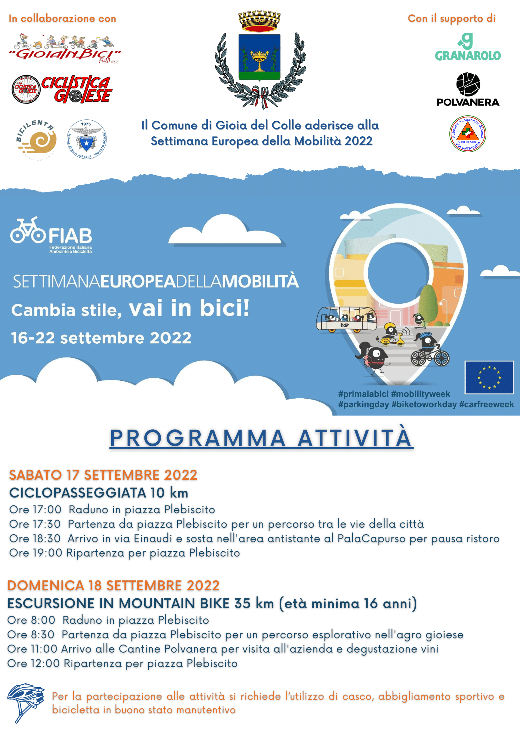 Organizzate in collaborazione con Gioia InBici, Ciclistica Gioiese, Club Alpino Italiano - sezione di Gioia del Colle "Donato Boscia", gruppo Bici Lenta e con il supporto di Granarolo, Cantine Polvanera e Pubblica Assistenza Gioiese, le predette attività si svolgeranno secondo il seguente programma: