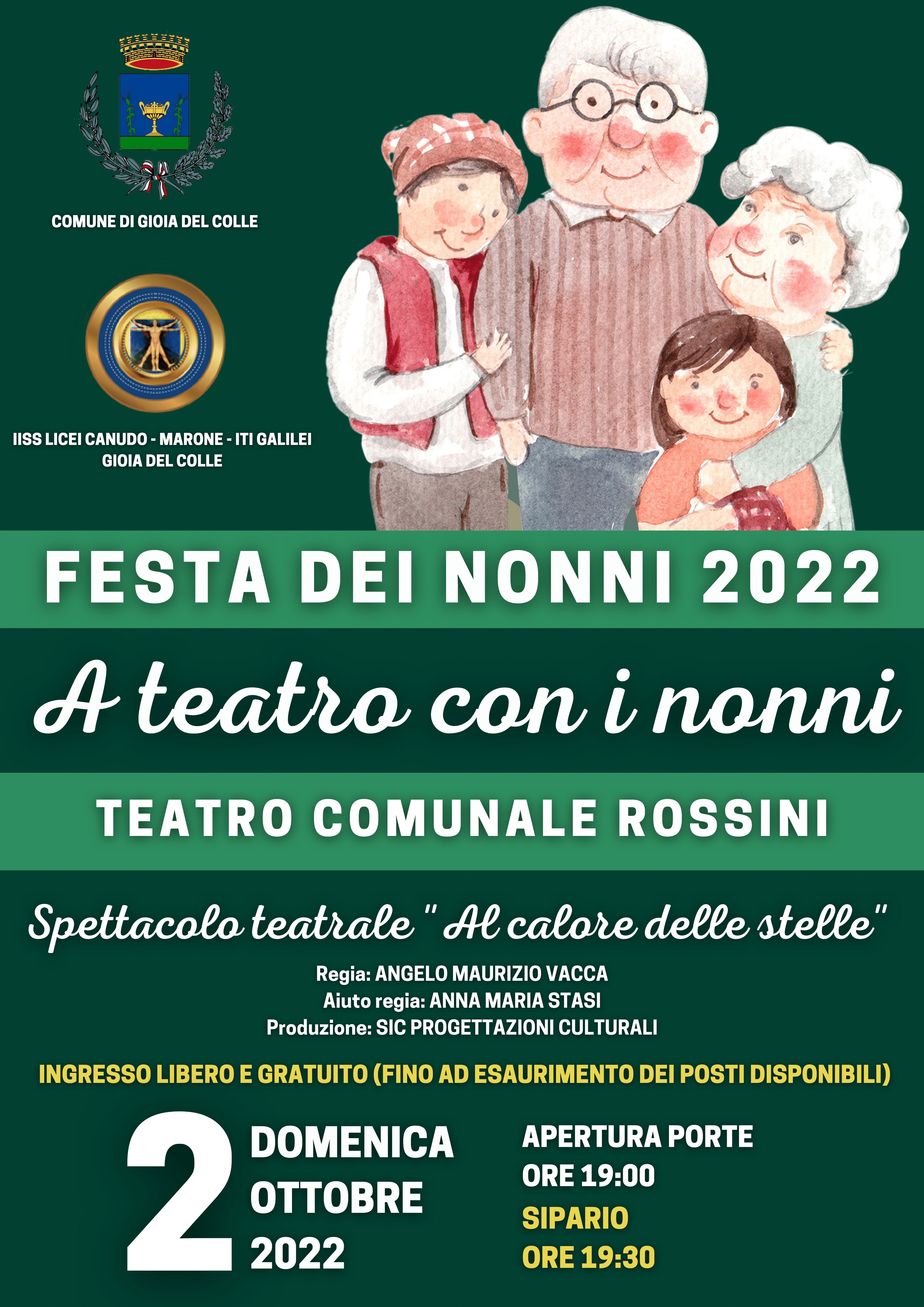 In occasione della Festa dei Nonni 2022 il Comune di Gioia del Colle e l’IISS Licei Canudo-Marone-ITI Galilei promuovono l’iniziativa “A teatro con i nonni”.