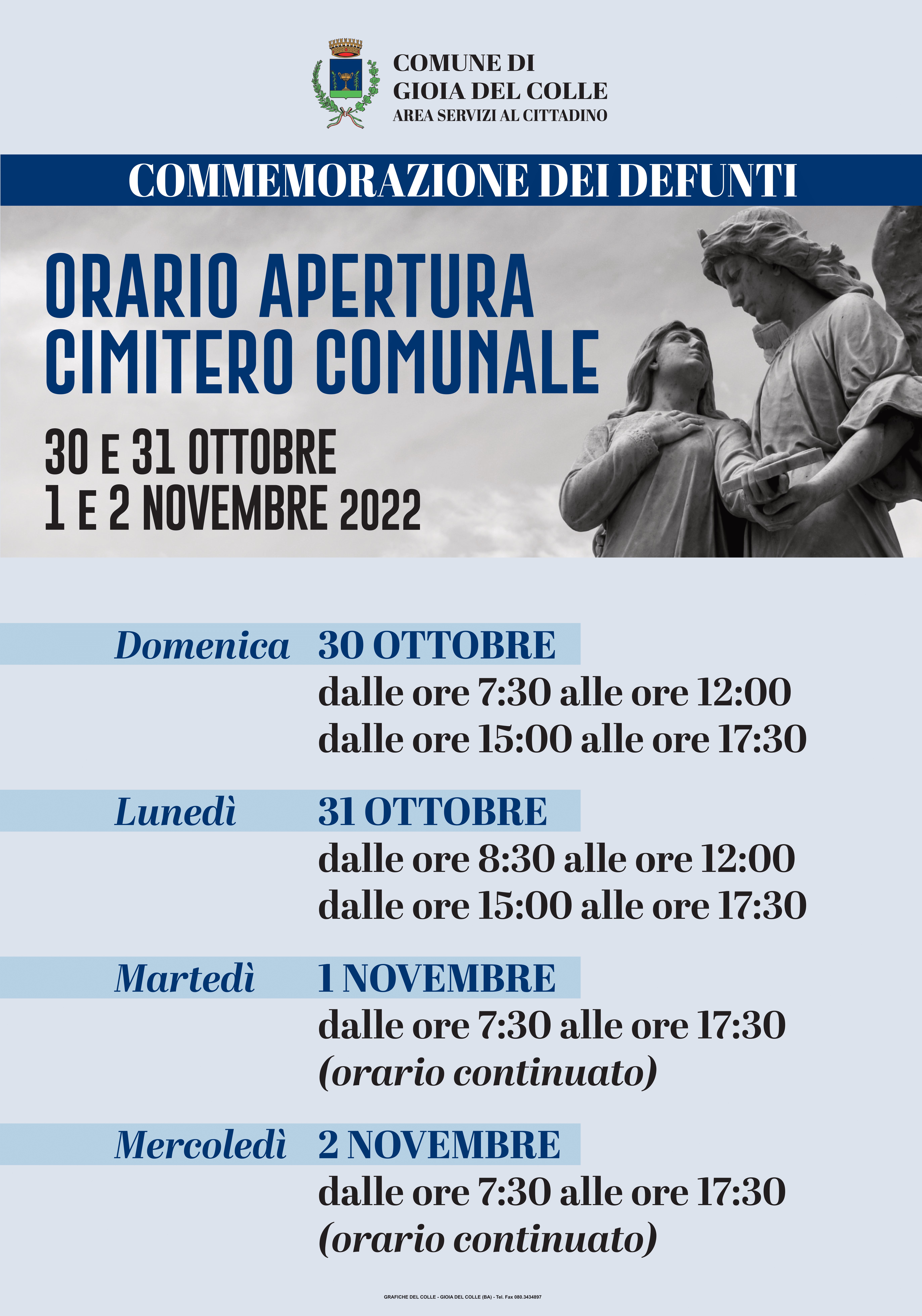 Si informa la cittadinanza che, in occasione della commemorazione dei defunti, il Cimitero comunale osserverā i seguenti orari di apertura al pubblico: