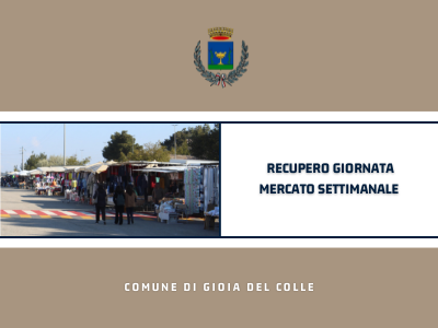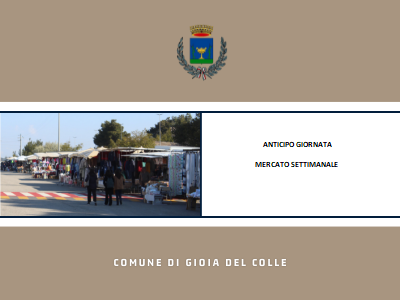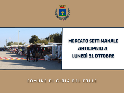 Con Ordinanza Dirigenziale n. 69 del 25.10.2022 è stata disposta l'anticipazione della giornata del mercato settimanale da martedì' 01.11.2022 a lunedì 31.10.2022 a causa della coincidenza con la festività di Ognissanti.