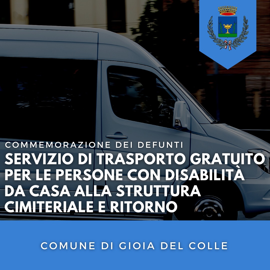 Si informa la cittadinanza che, in occasione della commemorazione dei defunti, è stato istituito per i giorni 1 e 2 novembre 2022, nella fascia oraria 9:00-12:00, un servizio di trasporto gratuito in favore delle persone con disabilità dalla loro abitazione alla struttura cimiteriale e ritorno.