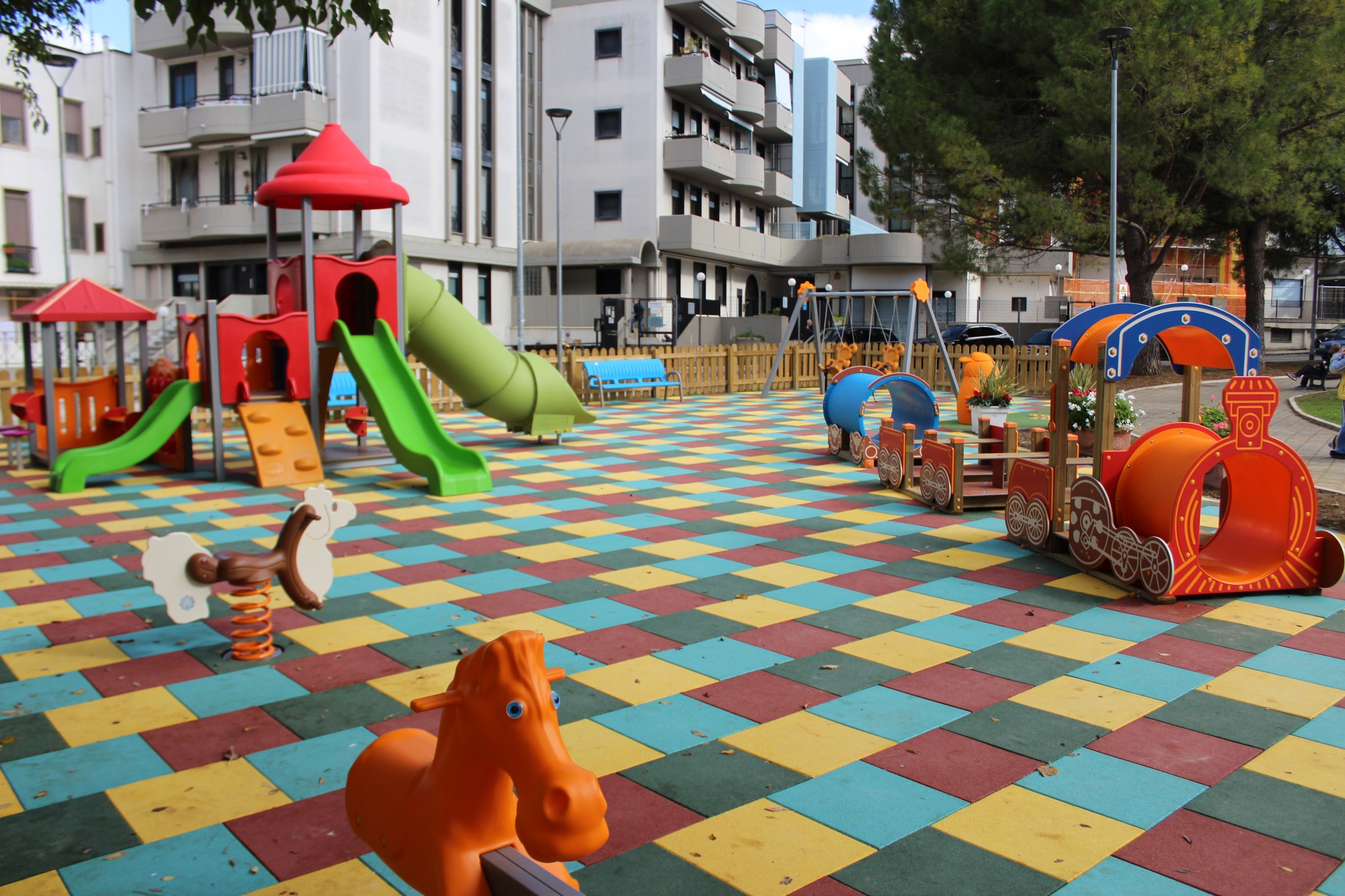 Finanziata sia con risorse comunali che con fondi statali destinati ad investimenti in infrastrutture sociali, l’area attrezzata occupa una superficie di circa 400 m² ed è dotata di una pavimentazione in gomma antitrauma multicolore, nuovi arredi, nuove strutture ludiche, giochi sensoriali e percorsi tattili che consentono la piena inclusione di tutti i bambini, anche con disabilità.