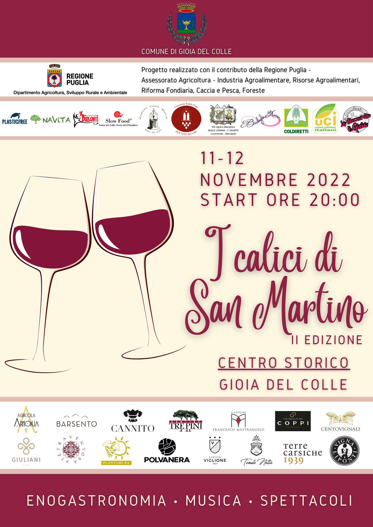Per l’occasione saranno allestiti, altresì, stand informativi a cura dell’IISS Agrario Alberghiero “Basile Caramia - F. Gigante”, dell’Uci, della Coldiretti, di Plastic Free e di Navita srl. L’evento sarà seguito in diretta da Radio Mi Piaci, media partner de “I Calici di San Martino 2022”, e si avvarrà del prezioso supporto della Croce Rossa Italiana - Comitato di Gioia del Colle e delle associazioni Gioia Soccorso e Pubblica Assistenza Gioiese.