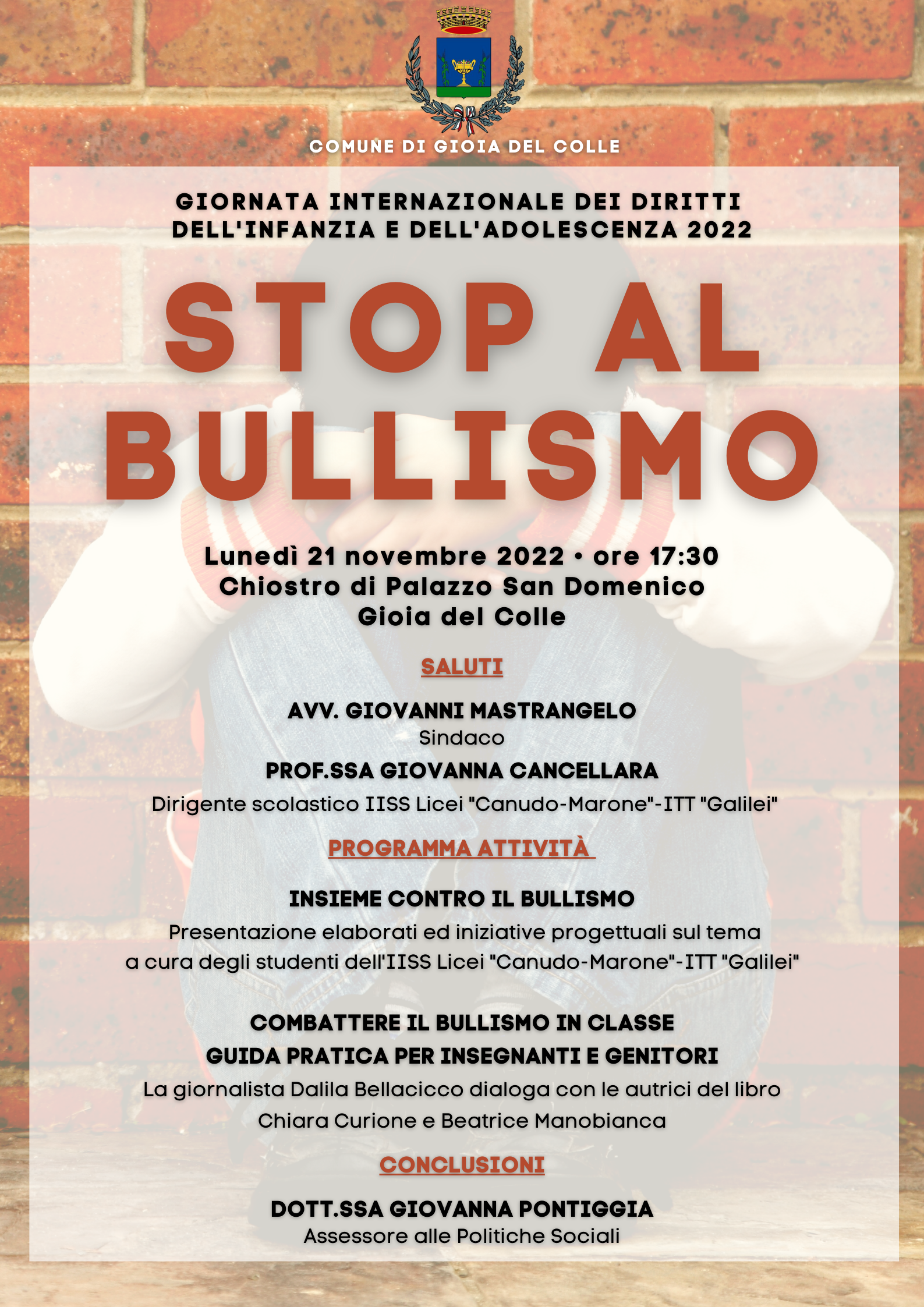 In collaborazione con l’IISS Licei "Canudo-Marone"-ITT "Galilei" di Gioia del Colle, l’Assessorato alle Politiche Sociali promuove l’evento “STOP AL BULLISMO”, incontro informativo e formativo sul fenomeno del bullismo in programma lunedì 21 novembre 2022, alle ore 17:30, nel Chiostro di Palazzo San Domenico.