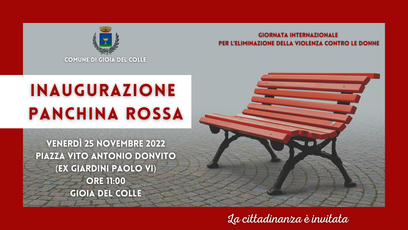 Venerdì 25 novembre 2022, in occasione della Giornata internazionale per l'eliminazione della violenza contro le donne, in piazza Vito Antonio Donvito, alle ore 11:00, si terrà la cerimonia di inaugurazione di una panchina rossa, realizzata dal Comune di Gioia del Colle in memoria di tutte le vittime di femminicidio.