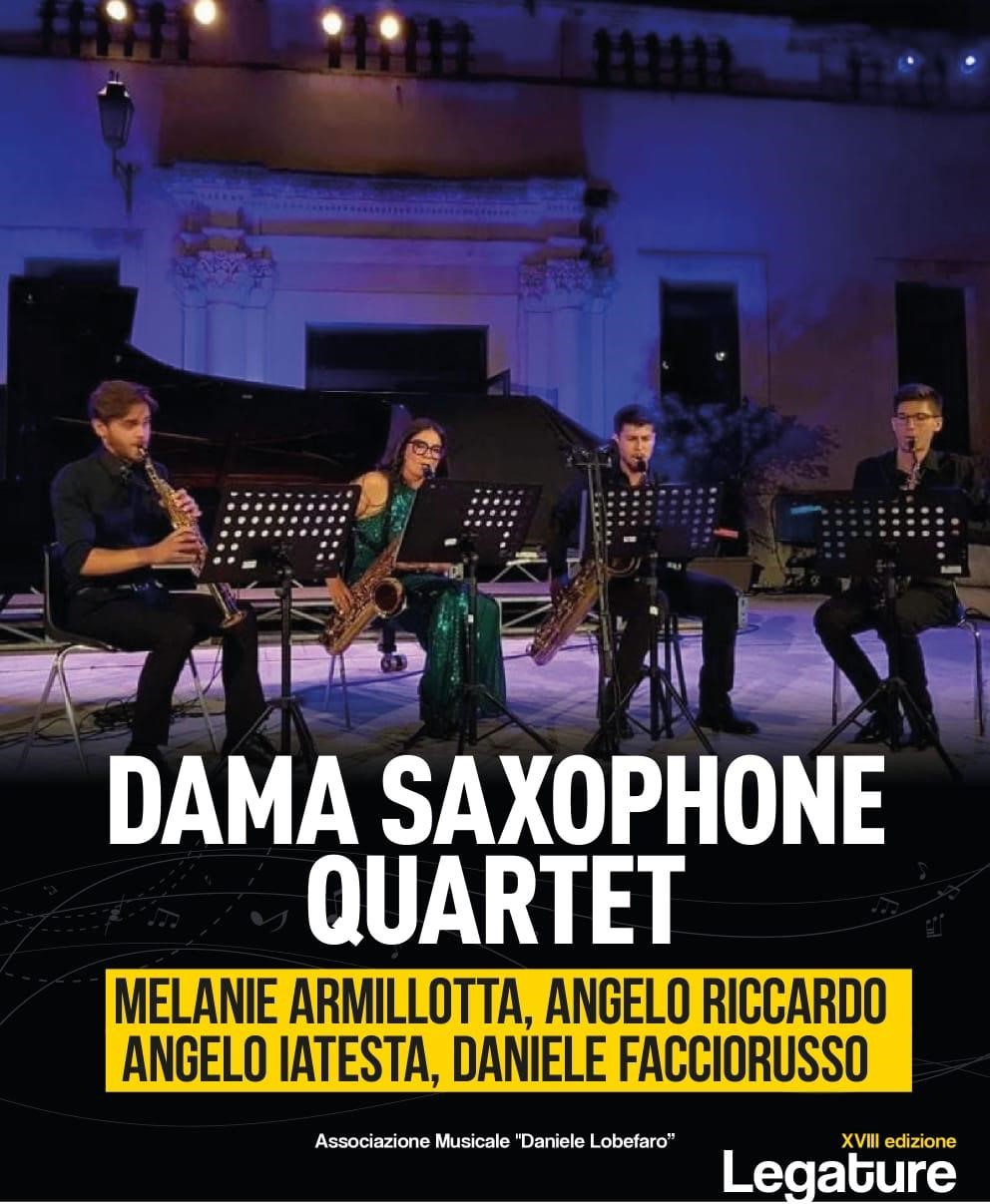 Domenica 11 dicembre, a partire dalle ore 19:00, si esibirà sul palco il Dama Saxophone Quartet che, dopo aver vinto il 2° premio – sez. Musica da Camera nell’ultima edizione del Concorso internazionale di musica “Pietro Argento”, torna nella nostra città per la rassegna musicale “Legature” curata dall’Associazione “Daniele Lobefaro”.