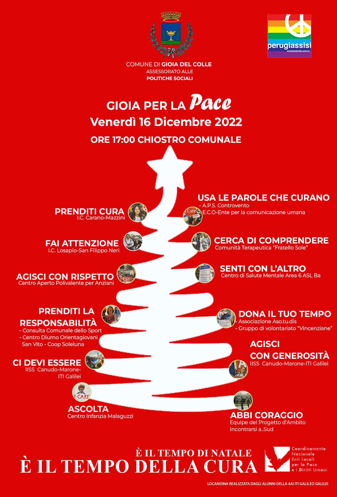 Il Chiostro di Palazzo San Domenico ospiterà domani, venerdì 16 dicembre, alle ore 17:00, l’evento “Gioia per la Pace. È il tempo di Natale. È il tempo della cura”, promosso dagli assessorati alle Politiche Sociali e alla Cultura-Pubblica Istruzione del comune di Gioia del Colle in collaborazione con enti del Terzo Settore e scuole secondarie di primo e secondo grado.