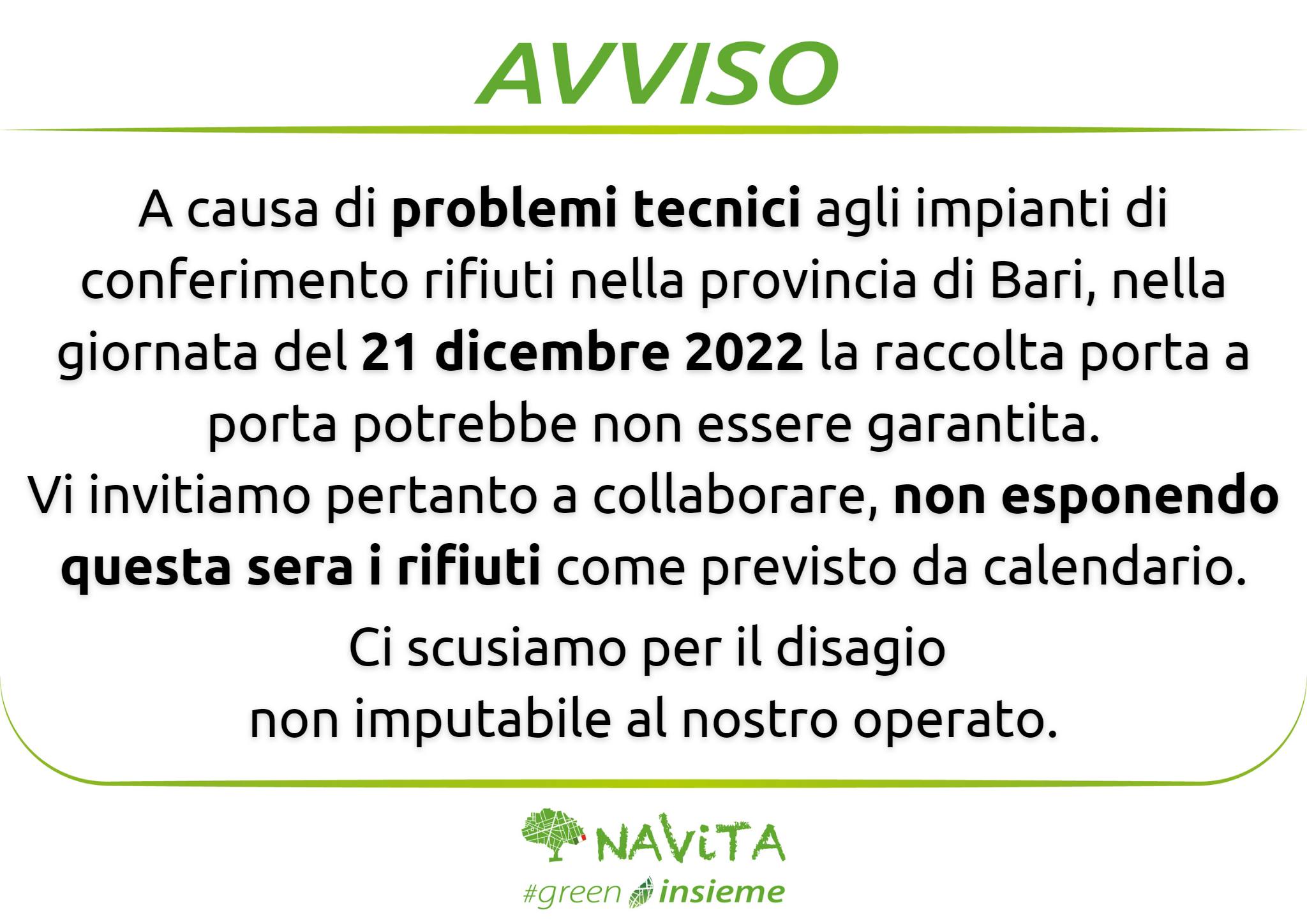 A causa di problemi tecnici agli impianti di conferimento rifiuti nella provincia di Bari, nella giornata del 21 dicembre 2022 la raccolta porta a porta potrebbe non essere garantita.