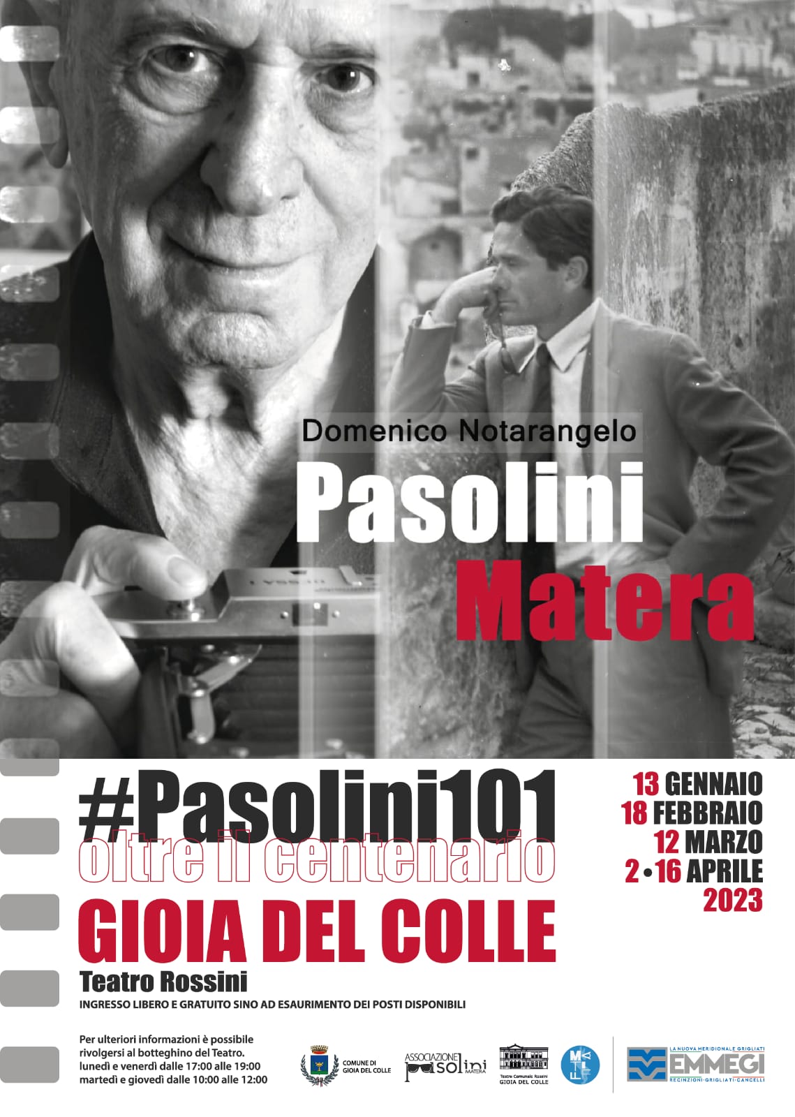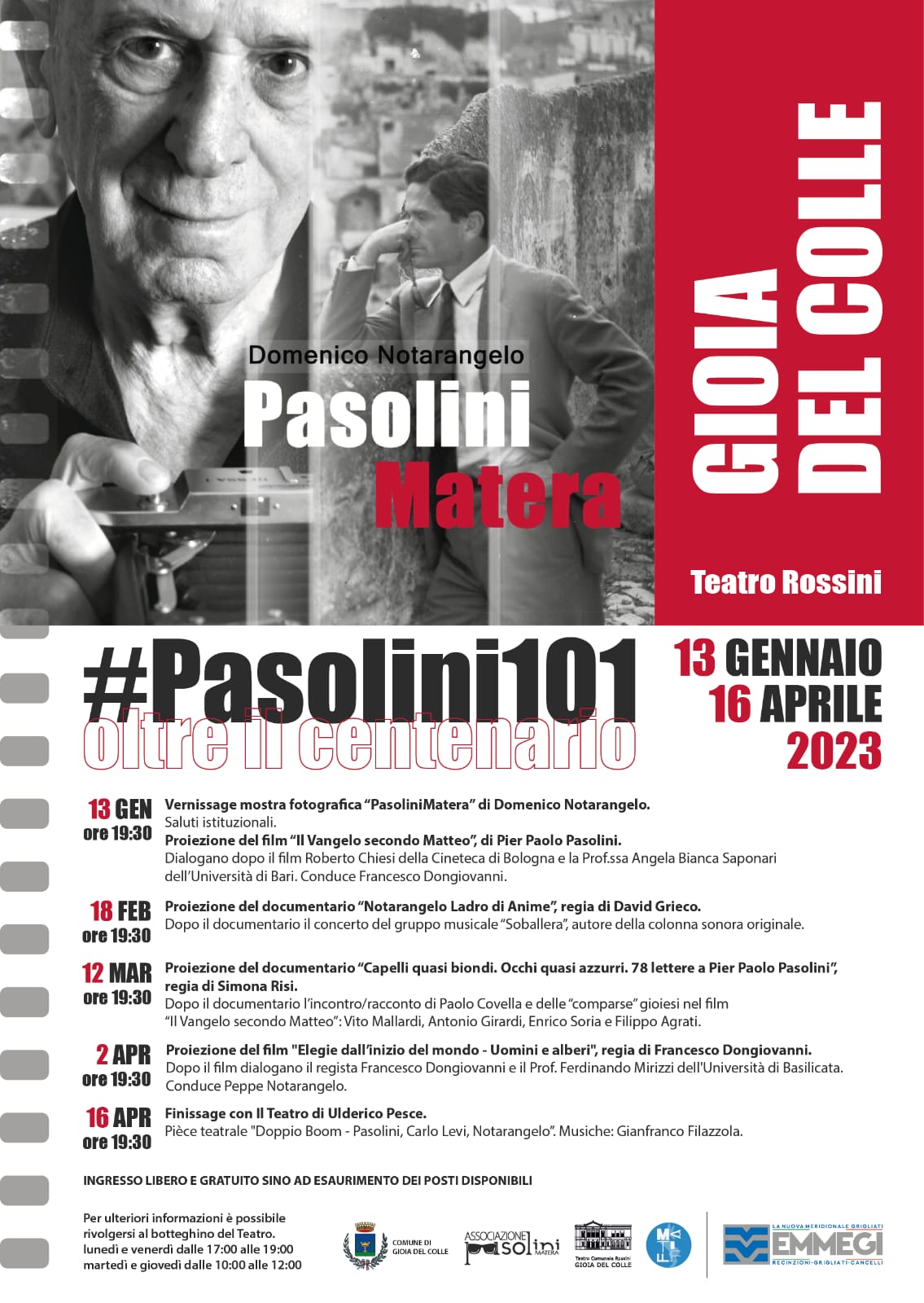 A 101 anni dalla nascita del grande maestro del cinema, il comune di Gioia del Colle promuove la rassegna “#Pasolini 101 Oltre il centenario” che, organizzata in collaborazione con l’associazione culturale “Pasolini” di Matera e con il prezioso contributo della Emmegi Grigliati S.p.a., dal 13 gennaio al 16 aprile 2023 contribuirà alla riscoperta e alla valorizzazione della sua opera e del suo pensiero.