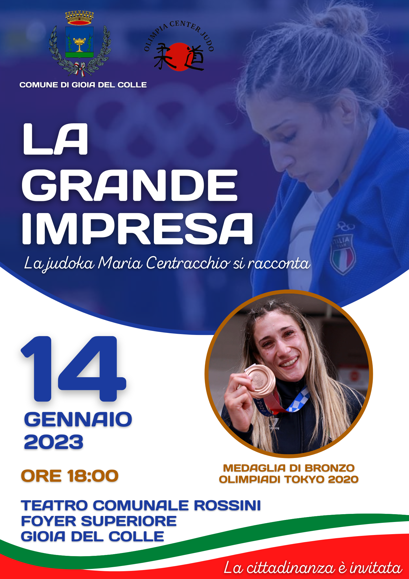 Nell’ambito delle iniziative finalizzate alla promozione dei valori educativi e formativi dello sport, l’Amministrazione comunale di Gioia del Colle è lieta di ospitare la judoka Maria Centracchio, medaglia di bronzo cat. 63 kg alle Olimpiadi di Tokyo 2020.