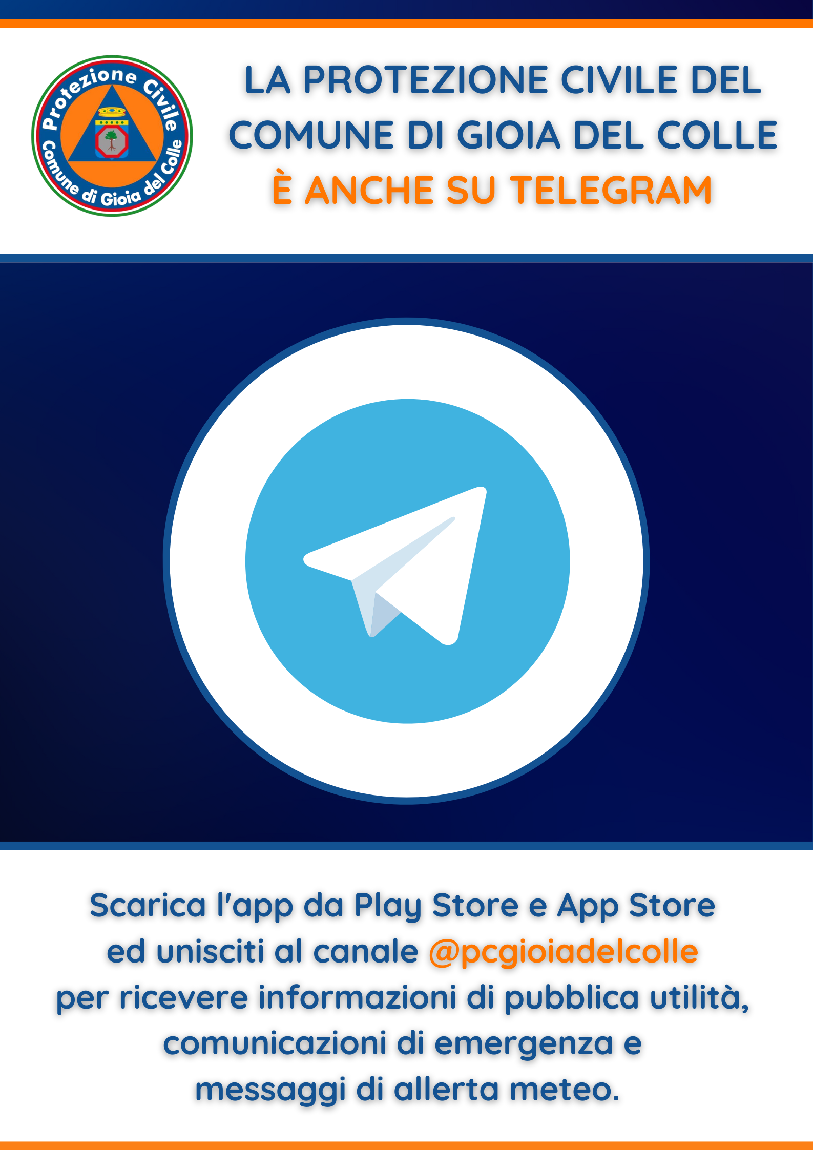 Attraverso l’iscrizione al canale @pcgioiadelcolle sarà possibile ricevere sui propri dispositivi elettronici informazioni di pubblica utilità, comunicazioni di emergenza e messaggi di allerta meteo.