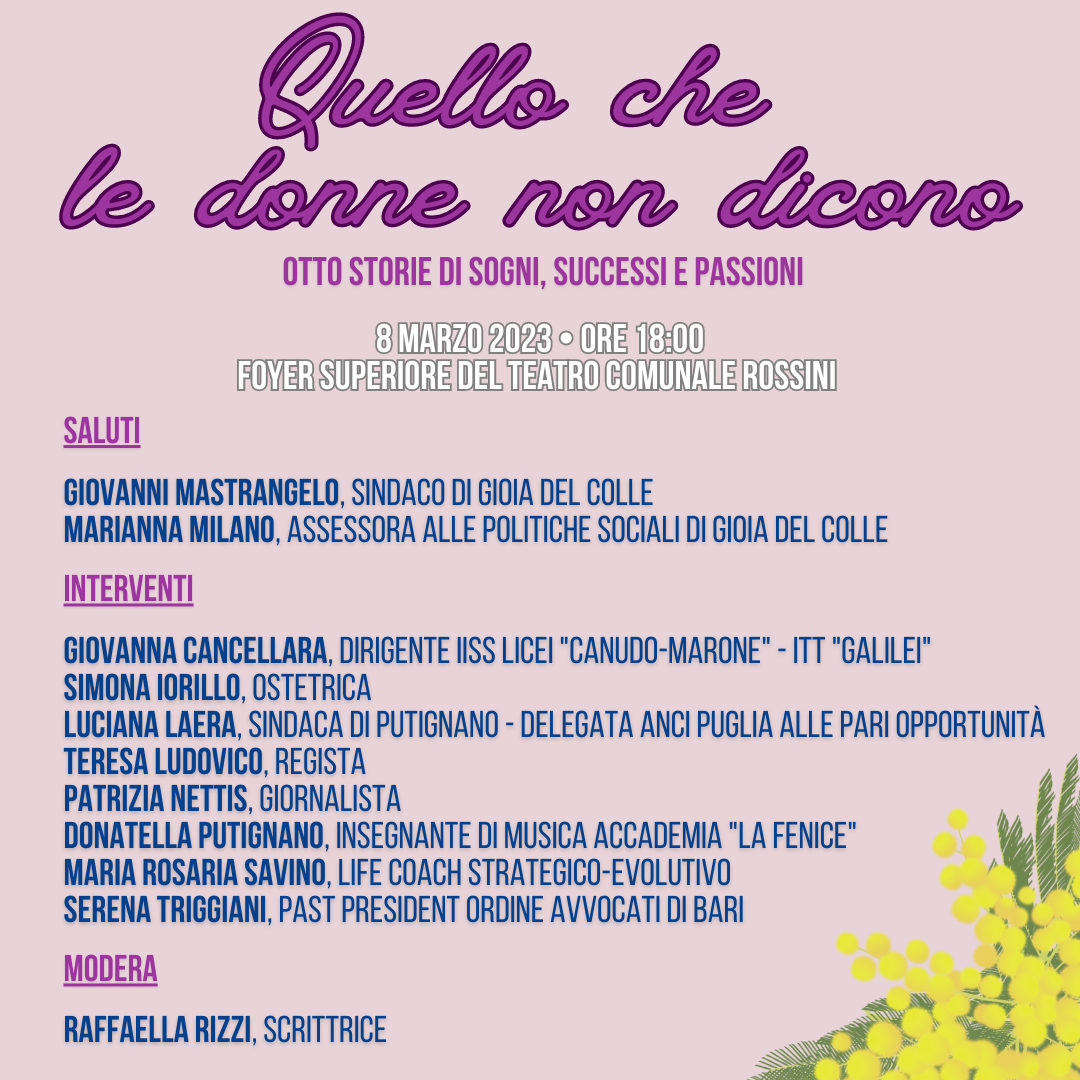In occasione della Giornata Internazionale della Donna 2023, il comune di Gioia del Colle promuove l’evento dal titolo “Quello che le donne non dicono. Otto storie di sogni, successi e passioni”, in programma mercoledì 8 marzo 2023, alle ore 18:00, nel foyer superiore del Teatro comunale Rossini.