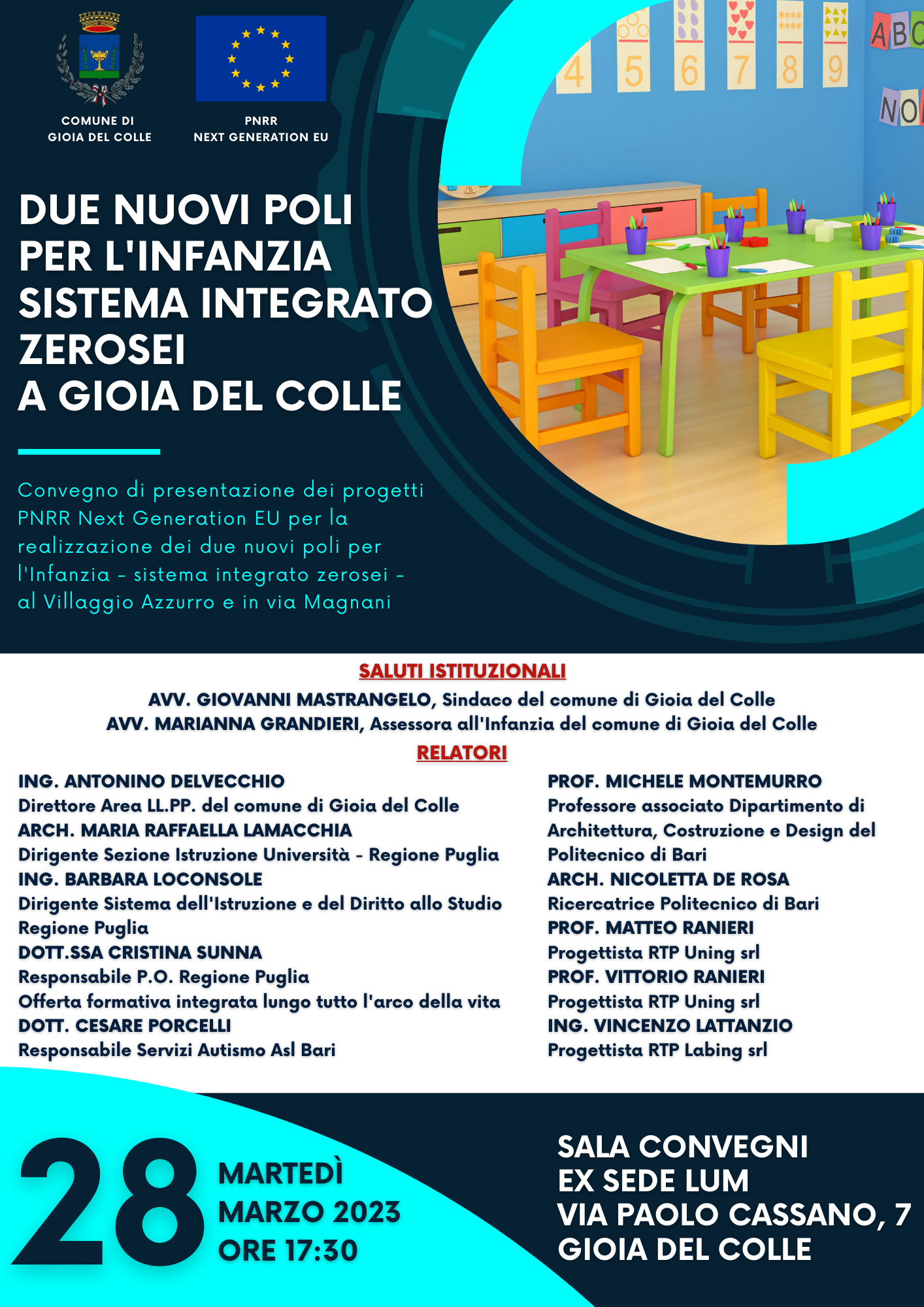 Martedì 28 marzo 2023, alle ore 17:30, nella sala Convegni dell’ex sede LUM (sita in via Paolo Cassano 7, Gioia del Colle) si terrà il convegno dal titolo “Due nuovi poli per l’infanzia - sistema integrato zerosei - a Gioia del Colle”.