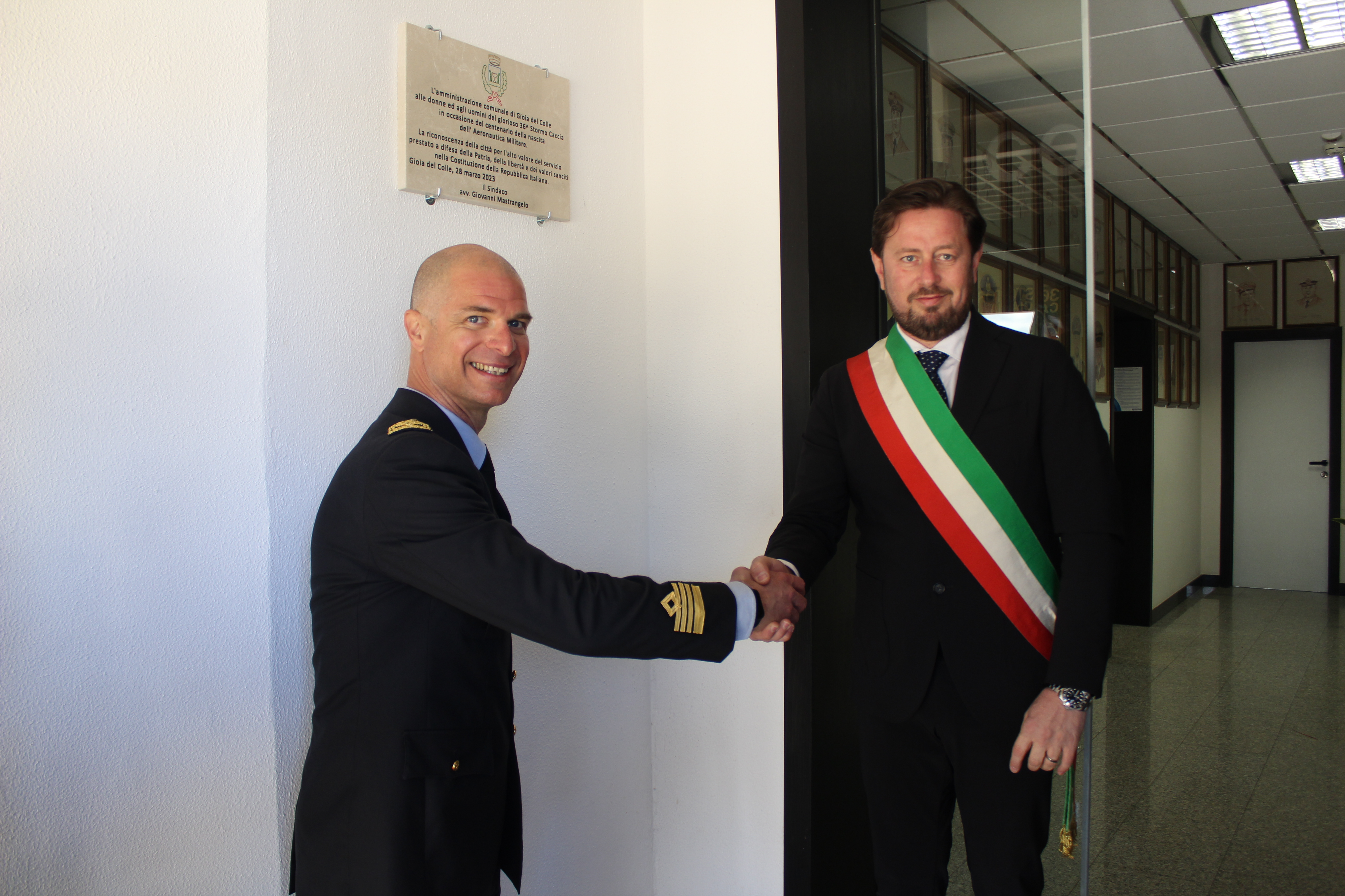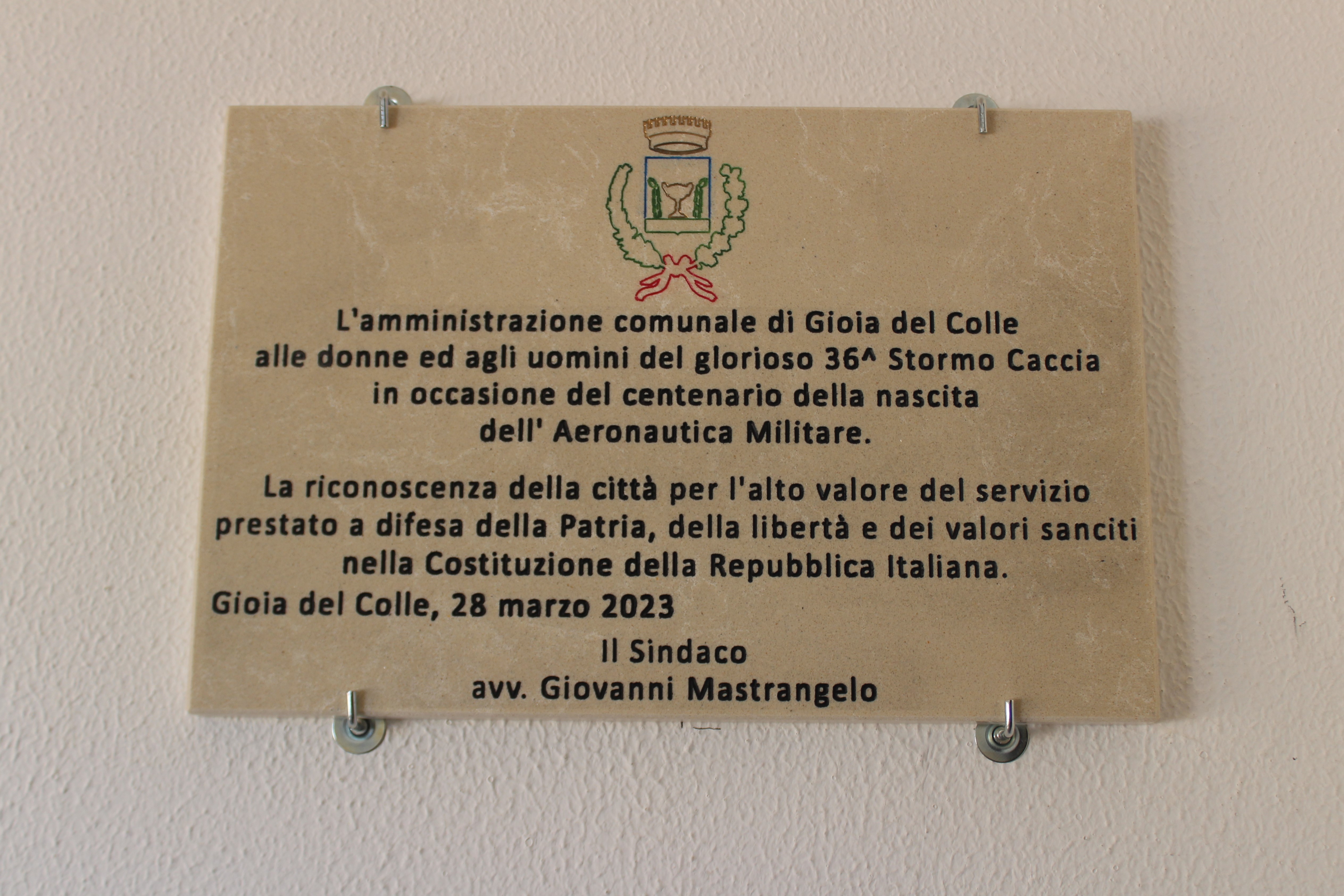Dopo la cerimonia dell'Alzabandiera, alla quale hanno partecipato anche docenti e studenti degli istituti comprensivi "Carano-Mazzini", "Losapio-San Filippo Neri", "Via Eva Gioia del Colle-Sammichele" e dell' IISS Licei "Canudo-Marone" - ITT "Galilei", il comandante del 36° Stormo Caccia Colonnello Pilota Massimiliano Pomiato ha tolto il velo ad una targa celebrativa donata dall'Amministrazione comunale che, in occasione della ricorrenza odierna, ha voluto rinnovare lo storico legame di amicizia tra la cittą di Gioia del Colle e l'Aeronautica Militare.