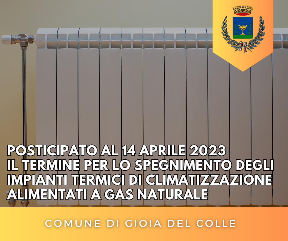 Si informa la cittadinanza che, con ordinanza n. 17 del 07.04.2023, il sindaco Giovanni Mastrangelo ha disposto l’ampliamento del periodo annuale di funzionamento degli impianti termici di climatizzazione alimentati a gas naturale in esercizio nel territorio comunale ???? ? ???????? ?? ?????? ???? (?????? ?????? ?? ??????????).