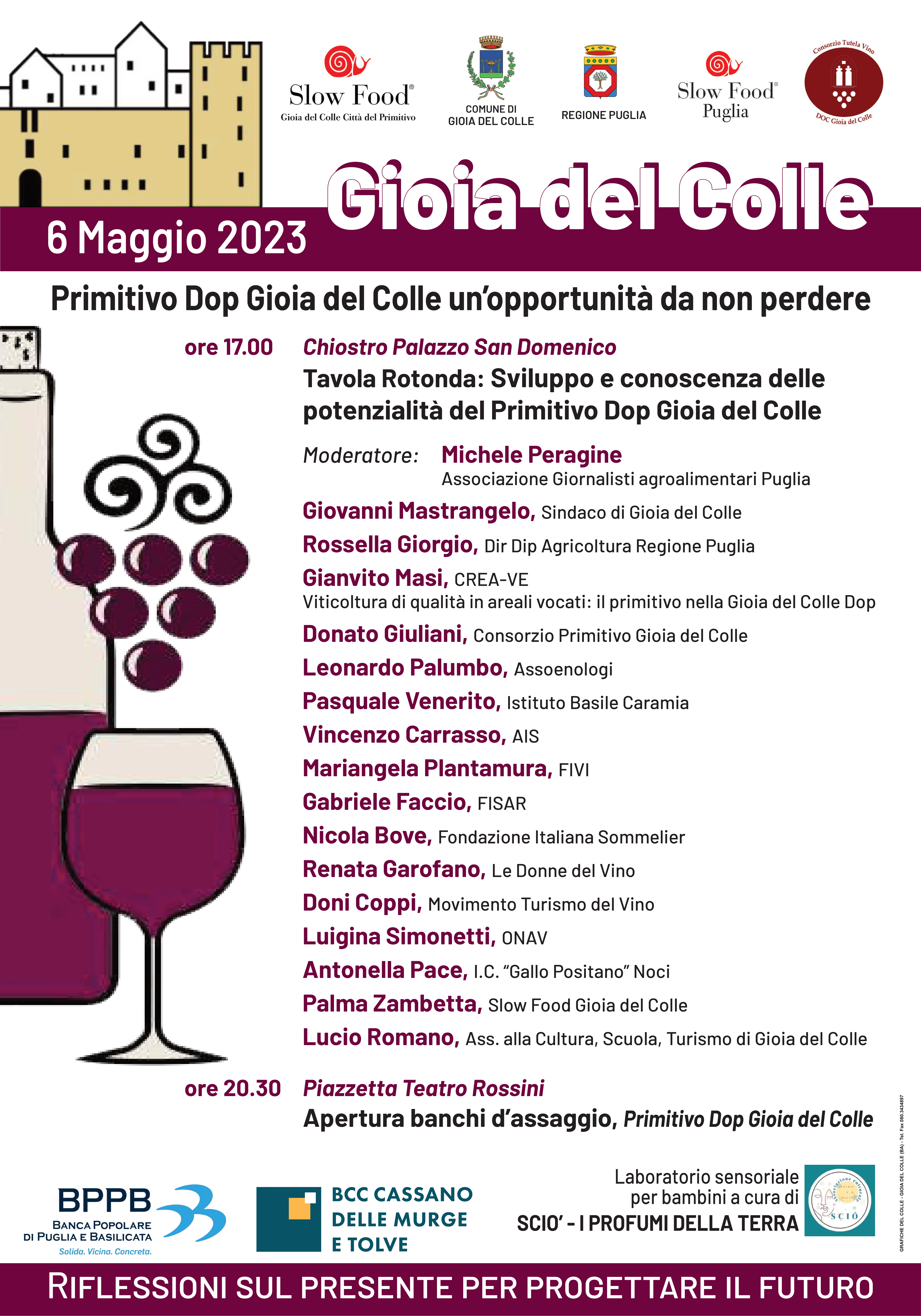 Alle ore 17:00 avranno inizio i lavori della tavola rotonda sul tema “Sviluppo e conoscenze delle potenzialità del Primitivo DOP Gioia del Colle”, che favorirà il confronto tra istituzioni civili, aziende vitivinicole, associazioni operanti nel settore e rappresentanti del mondo scolastico sulle possibili strategie da attuare per la valorizzazione e la promozione di una delle eccellenze del territorio.
