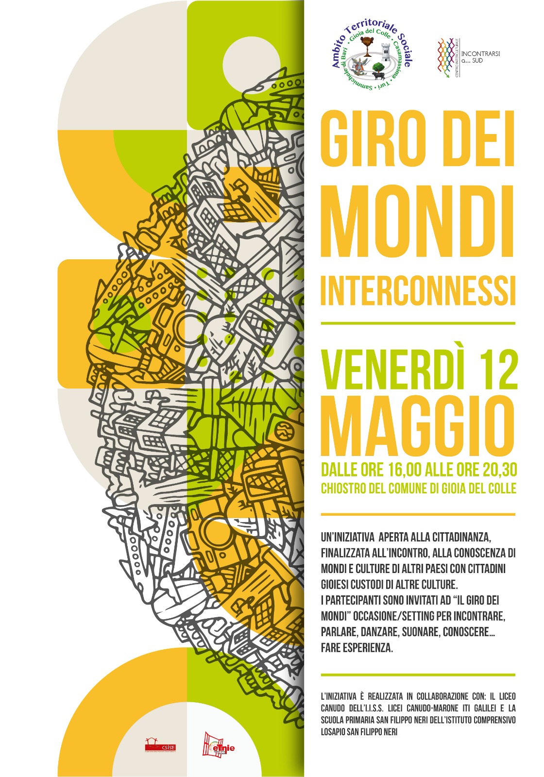 Venerdì 12 maggio il chiostro di Palazzo san Domenico ospiterà l’evento intitolato “Il giro dei mondi interconnessi”, promosso dal Centro Interculturale “Incontrarsi a…Sud” dell’Ambito territoriale sociale di Gioia del Colle (comprendente anche i comuni di Casamassima, Sammichele di Bari e Turi), coordinato dalla responsabile dell'Ufficio di Piano di Gioia del Colle, dott.ssa Irene Turturo.