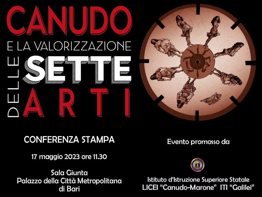 Mercoledì 17 maggio 2023, alle ore 11:30, nella Sala Giunta del Palazzo della Città Metropolitana di Bari, si svolgerà la conferenza stampa di presentazione del progetto “Canudo e la valorizzazione delle sette arti”, promosso e curato dall’IISS Licei “Canudo-Marone” – ITI “Galilei” di Gioia del Colle in occasione del centenario della morte dello scrittore, poeta e teorico cinematografico Ricciotto Canudo.
