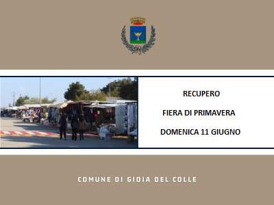 Si rende noto che con Determinazione del Responsabile di Area n. 607 del 08.06.2023 č stato stabilito di recuperare nella data di domenica 11 giugno 2023, la giornata dedicata alla Fiera in onore del Santo Patrono San Filippo Neri inizialmente prevista per il giorno 21 maggio 2023, che non si č potuta regolarmente svolgere a causa delle avverse condizioni meteo.